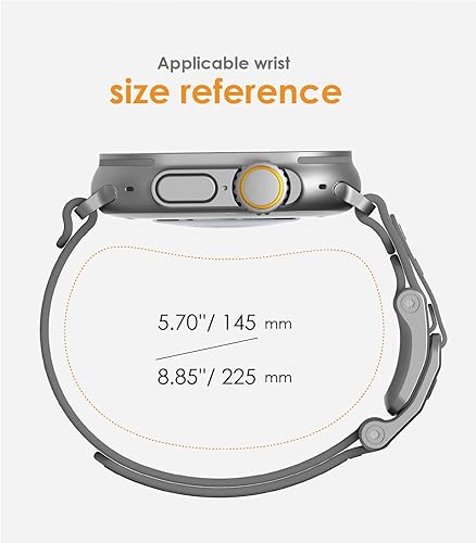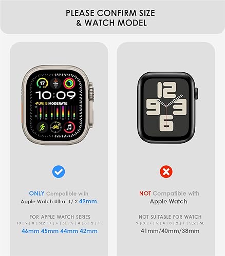 • Double strap Compatibility: For Apple Watch Ultra [1/2/3] 49mm and Apple Watch Series 10/11 [46mm] 9/8/SE2/7[45MM]6/SE/5/4 [44MM]. Fits wrist sizes of 5.70" (145mm) - 8.85" (225mm).NOTE: (Compatibility ranges for short and standard straps add up to coverage)