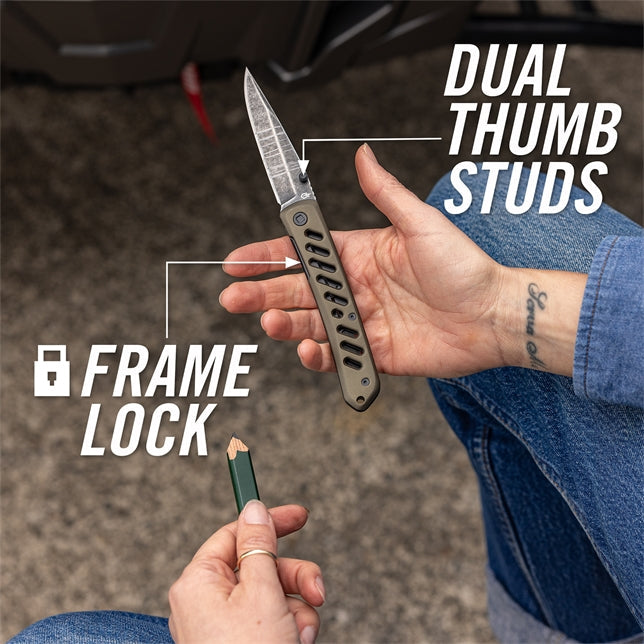 7Cr17Mov Stainless Steel Clip Point Blade Plain Edge Blade Dual Thumb Studs Frame Lock Pocket Clip Lanyard Hole Jimping Overtravel Plate w/ Inlay Machined aluminum handle Limited lifetime warranty