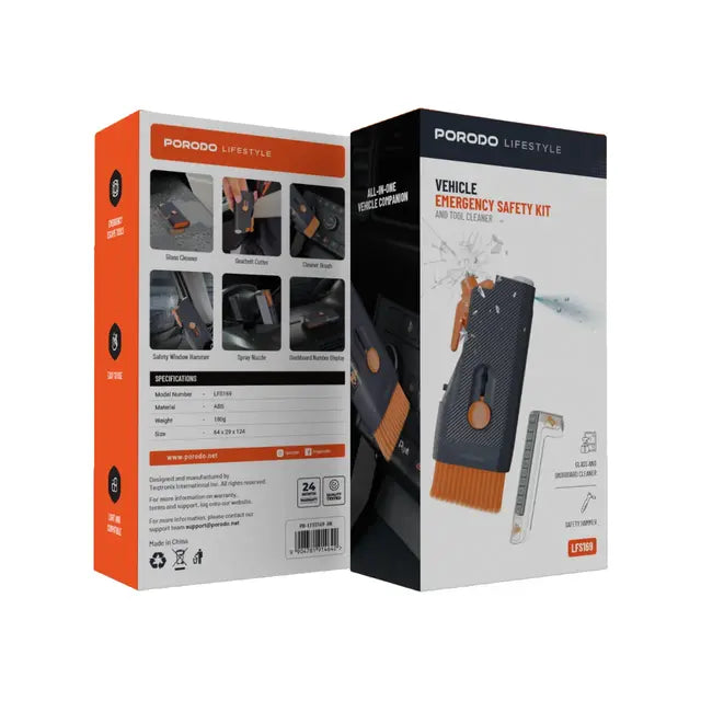 The Porodo Lifestyle Vehicle Emergency Safety Kit is intelligently designed to provide important equipment for your roadside safety and peace of mind. The small, lightweight kit features a dashboard number display. This makes it easy to see and quickly access important contact details in an emergency. It includes a seatbelt cutter and a safety window hammer. This means you can get out of your car quickly if needed. The package is great for keeping your car and windshield clear. It includes a cleaning brushglass cleaner, and a spray nozzle. Each tool is made from durable ABS plastic. They are built for reliability and ease of use. This emergency safety pack offers both mobility and functionality. It’s perfect for keeping you organized and ready for the unexpected. The Porodo Lifestyle Vehicle Emergency Safety Kit blends mobility and functionality to keep you prepared wherever your travels take you, whether you're planning for unforeseen circumstances or just want to stay organized.