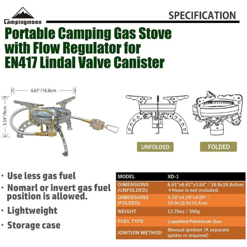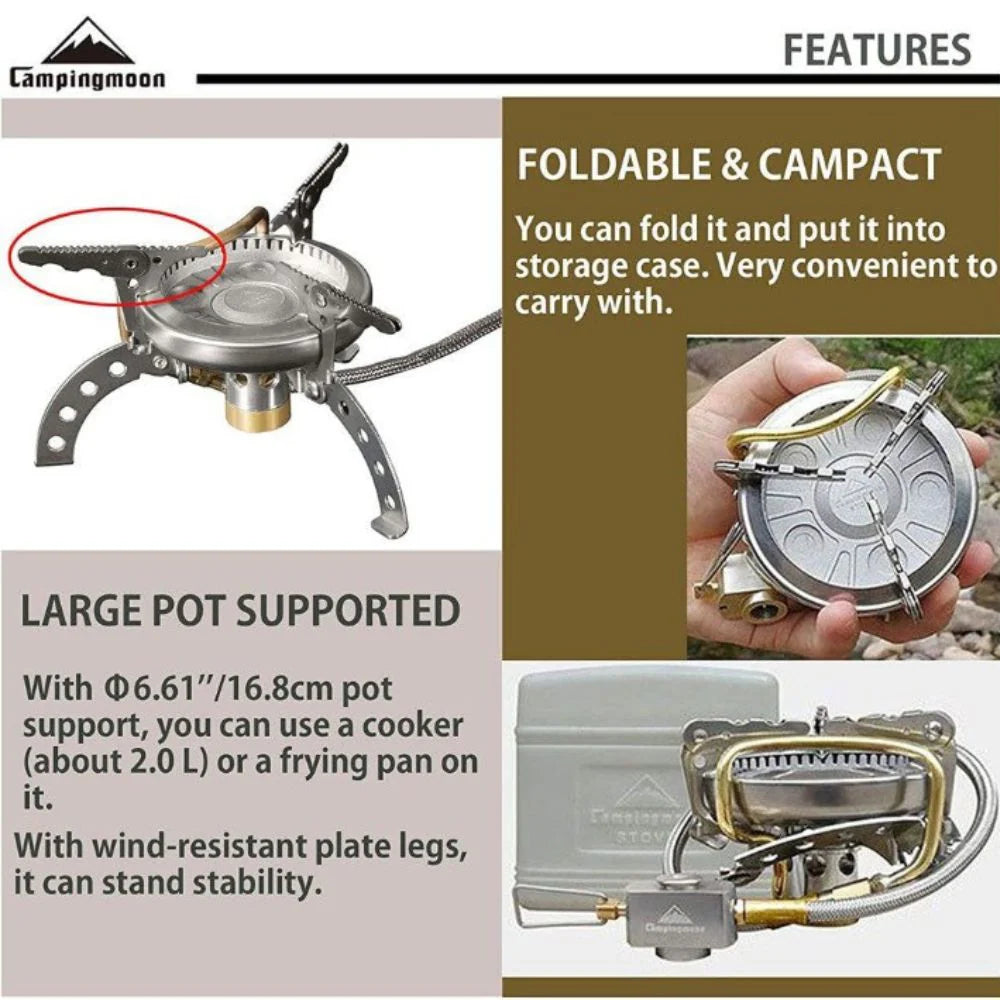 Campingmoon’s gas stove is foldable and can be put into attached storage case to carry with. It is suitable for your camping, backpacking, hunting, BBQ, barbecue and other outdoor occasions.