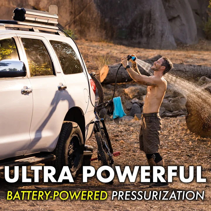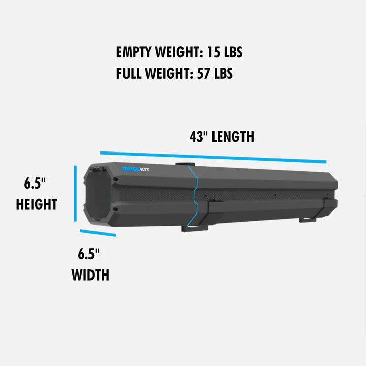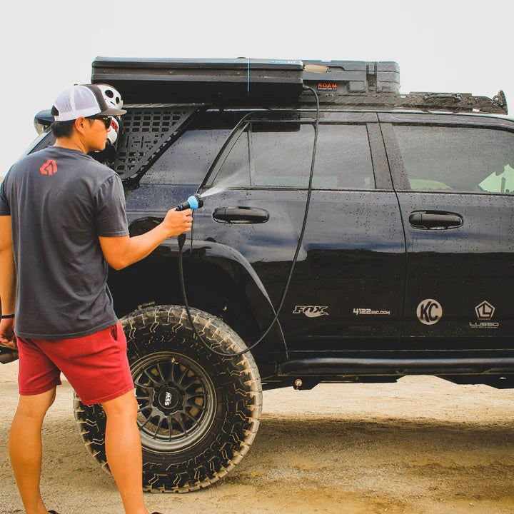 Introducing the 5-gallon RinseKit Rack Shower, the world’s only completely electric mountable portable shower. Equipped with battery-powered pressurization, the Rack Shower boasts a consistent high-pressure spray so you can wash up wherever the road leads. That battery also makes it super easy to use - simply pour in water, press the power button and spray. Its built tough with military-grade materials and is mountable on all four sides so it can be attached to any rack or truck bed. The Rack Shower is designed to be the ultimate portable shower for offroad adventurers - made for going beyond the boundaries.